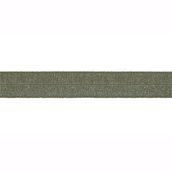 Schrägband mit verwebten Lurexgarn in khakifarben gemustert. Dieses Schrägband ist ideal zum Einfassen von offenen Kanten von verschiedenen Stoffarten für einen sauberen Übergang.