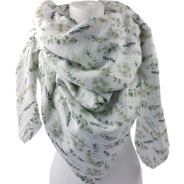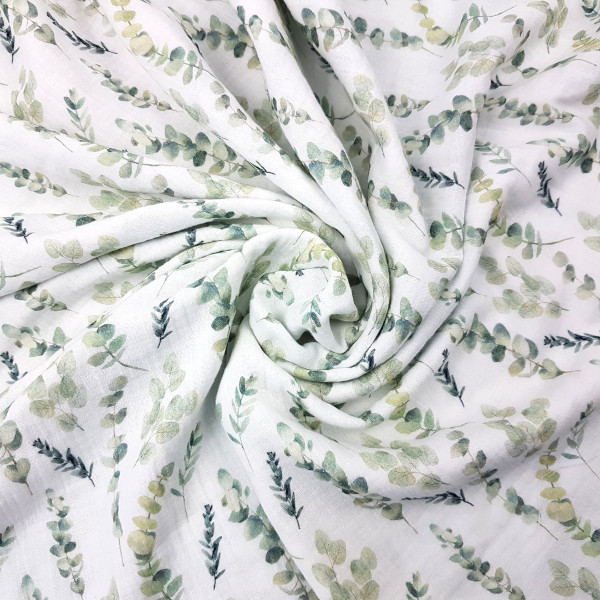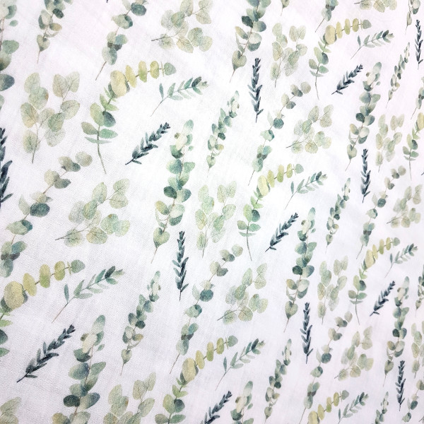 Toller Musselin Double Gauze in ecrufarben gemustert mit Eukalyptuszweigen