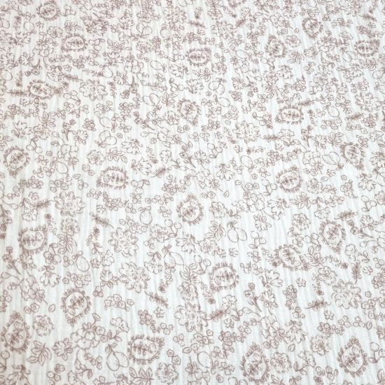 Weich fallender Musselin in offwhite mit romantischen Blumen gemustert.