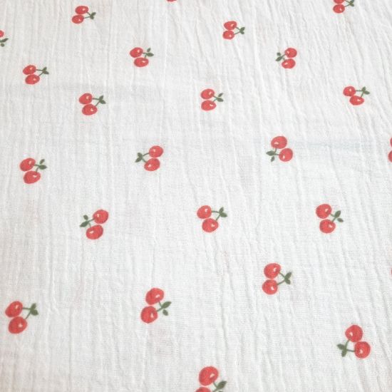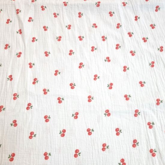 Weiche fallender Musselin in offwhite mit wasserfarbenden Kirschen gemustert.